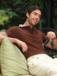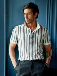 Men's Cream & Black Textured Vertical Striped Knit Polo T-Shirt