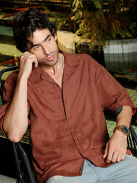 Men's Rust Self-Design Relaxed Fit Cuban Collar Shirt
