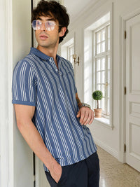 Men's Blue Vertical Striped Polo T-Shirt