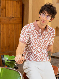 Men's Mauve Geometric Print Cotton Blend Polo T-Shirt